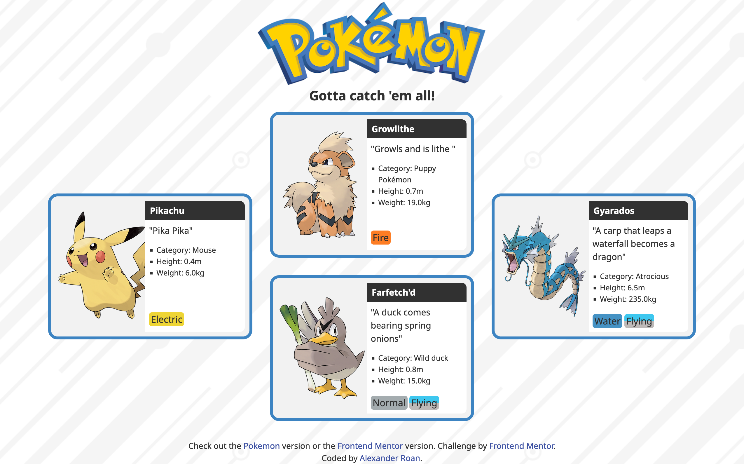 I created a Pokemon themed four card layout in HTML. This was inspired by one of the challenges at frontendmentor.com.