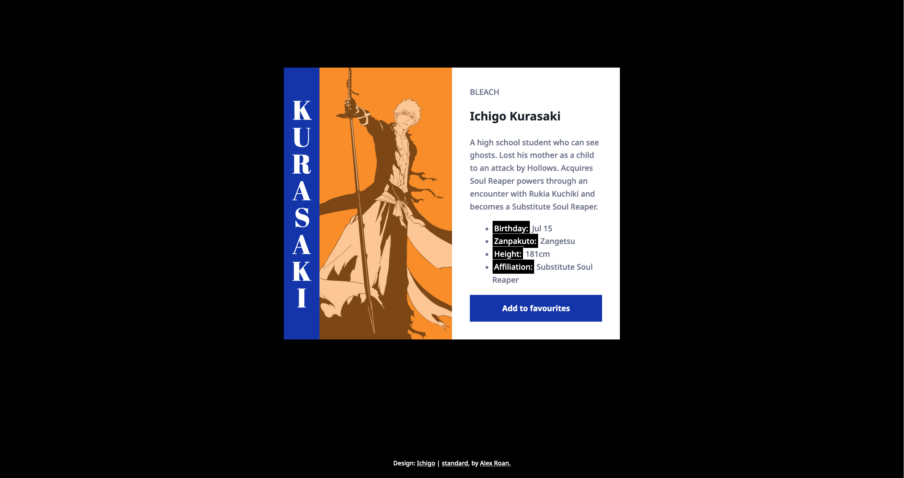 I created a product card page in HTML and CSS based on the character Ichigo from the Anime called Bleach. This was an alternate design for one of the challenges on the Frontend Mentor website.
