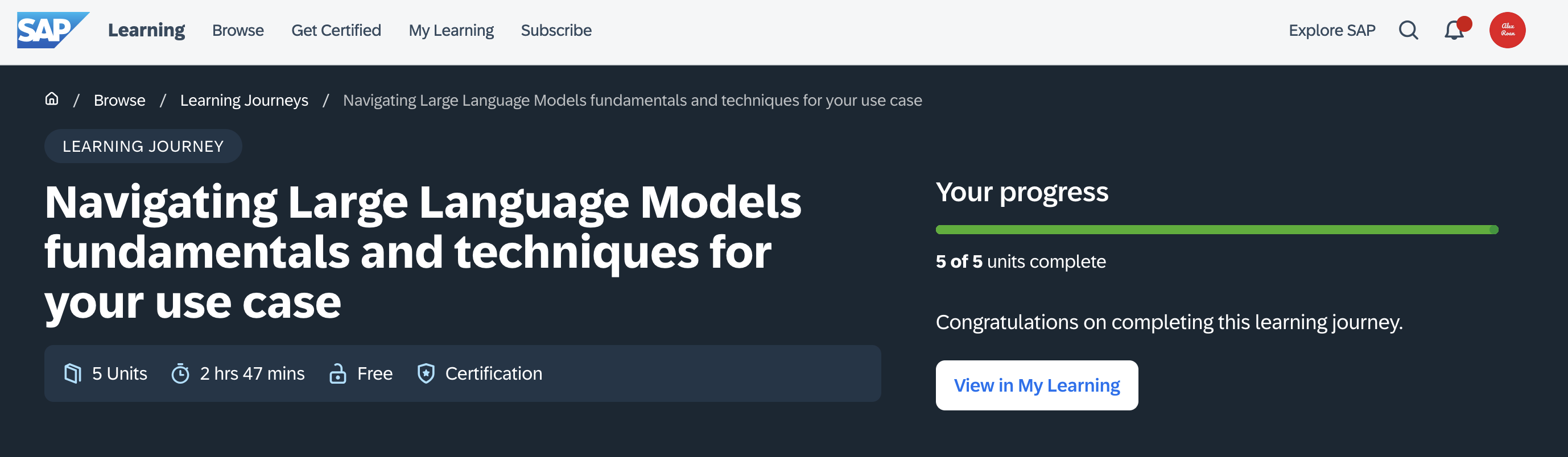 I completed the SAP learning journey for Navigating Large Language Models fundamentals and techniques for your use case.